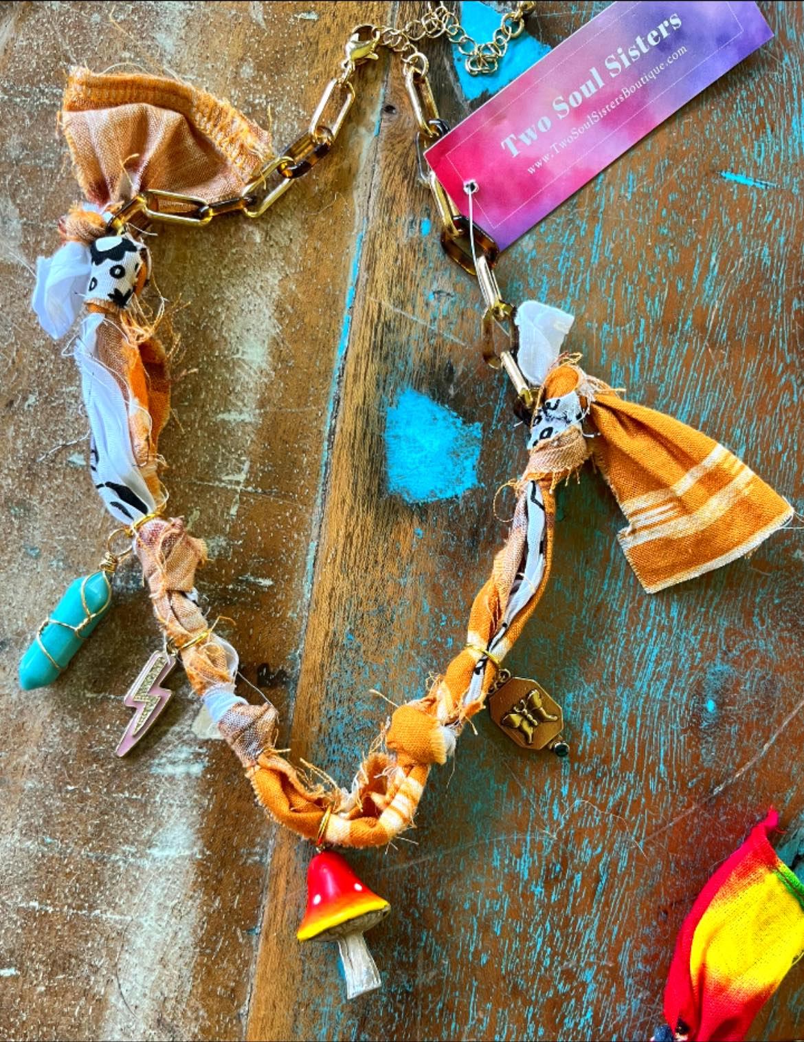This necklace is crafter with scrap fabrics from our customs!! We use every scrap of clothing from our upcycles through fun creations like this!!