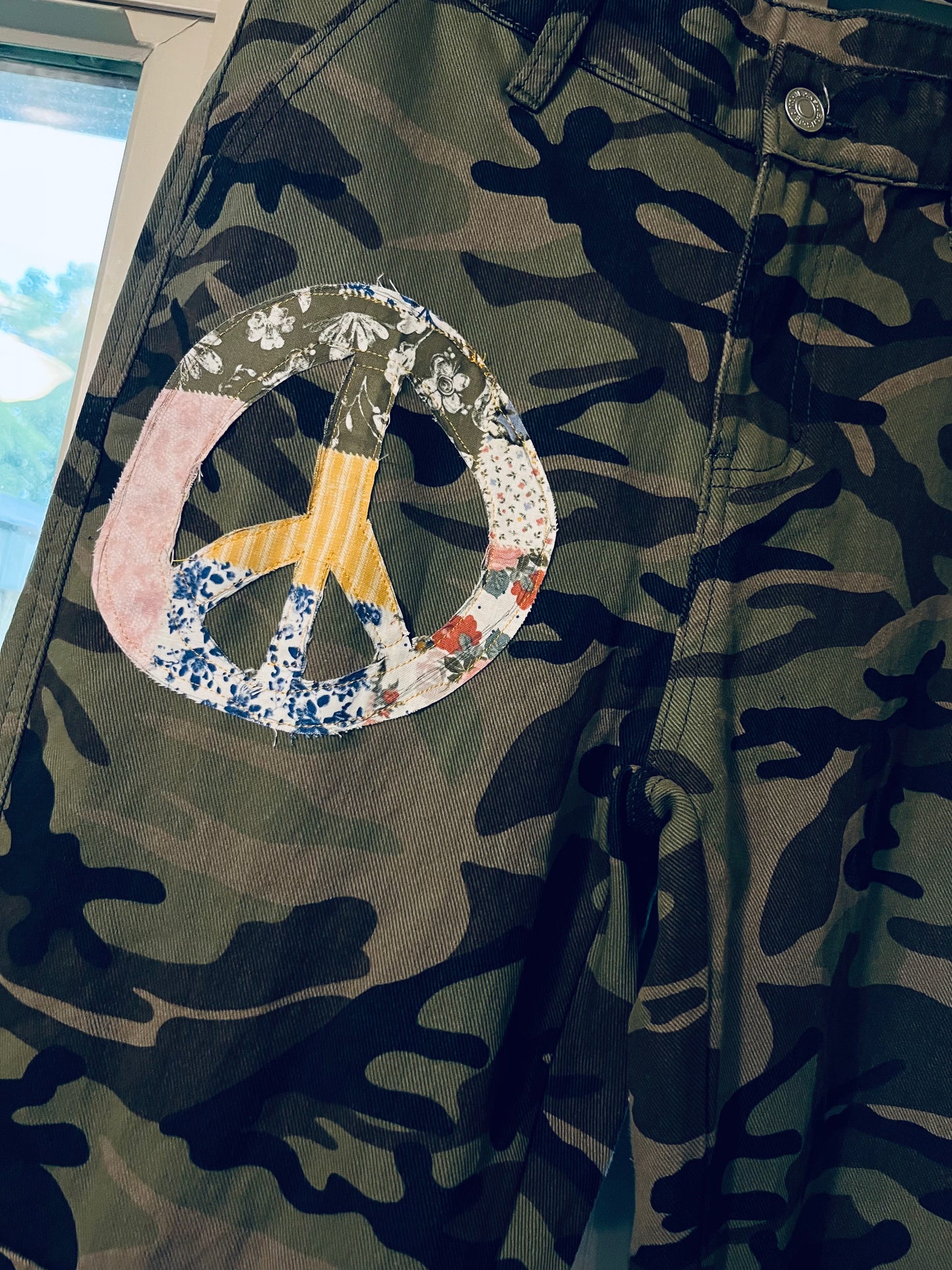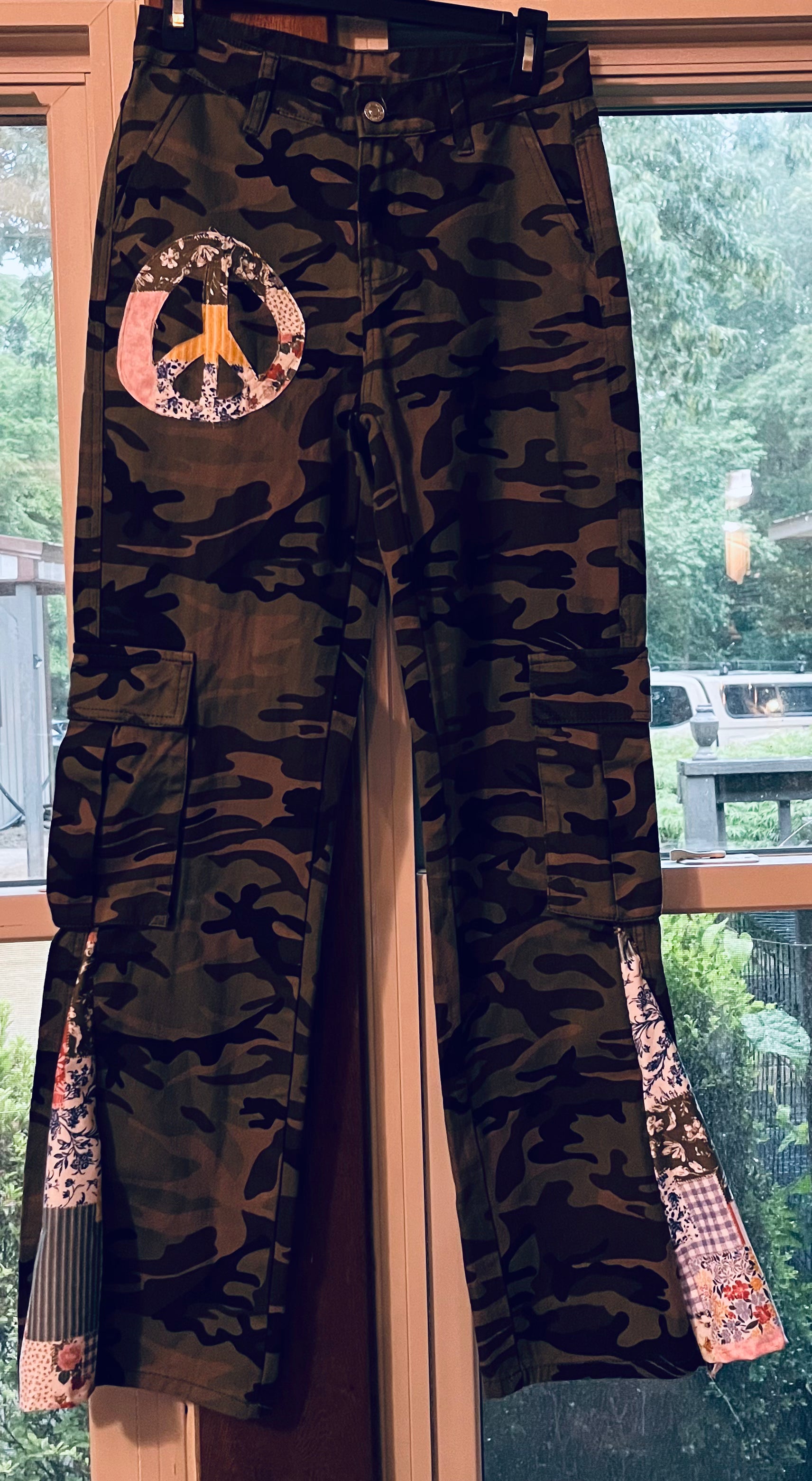These cargo pants are 100% one of a kind with patchwork bells and an added peace sign that screams Woodstock 1969!!