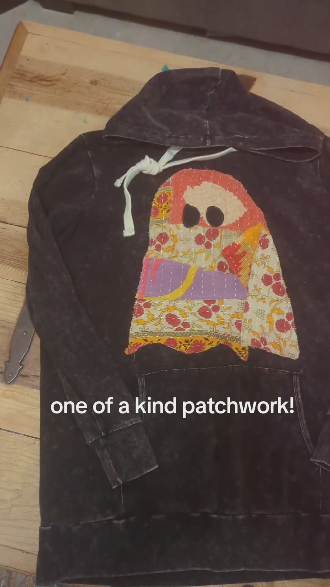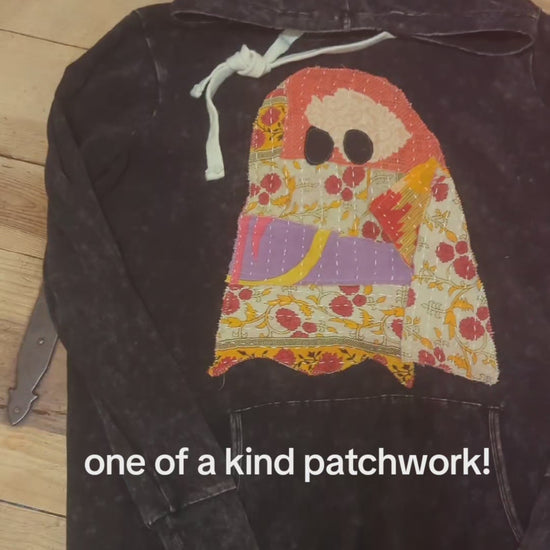 Longer length hoodie upcycled with a one of a kind patchwork ghost crafted from T-shirt reminders and kantha fabric! Fits size xlXl