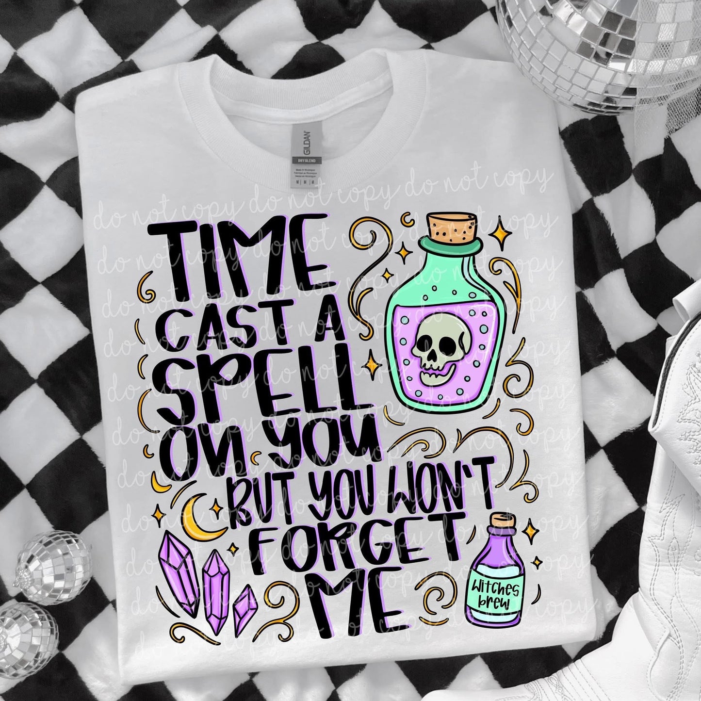 Add a little magic to your wardrobe with our Time Cast a Spell on You tees! Featuring bold, mystical lettering with sparkling stars, crystals, and colorful potion bottles, this enchanting piece is perfect for anyone who loves a spooky aesthetic with a touch of whimsy.